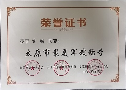 近日,太原市政集團安裝公司辦公室主任賈璐被太原市婦女聯合會、太原市退役軍人事務所、太原警備區政治工作處評為“太原市最美軍嫂”。