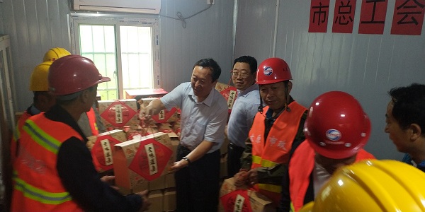慰問中,太原市總工會黨組書記、常務副主席馮潤春來到施工現(xiàn)場及宿舍區(qū)與農(nóng)民工一一握手,并把月餅親手送到了農(nóng)民工手中,他希望農(nóng)民工不忘初心,砥礪前行,為太原城市建設添磚加瓦,再立新功!