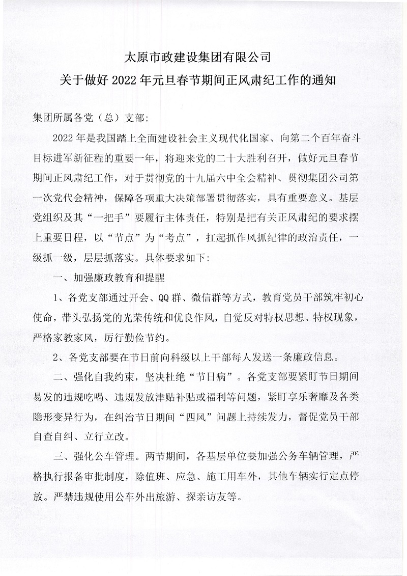 太原市政建設集團有限公司關于做好2022年元旦春節期間正風肅紀工作的通知