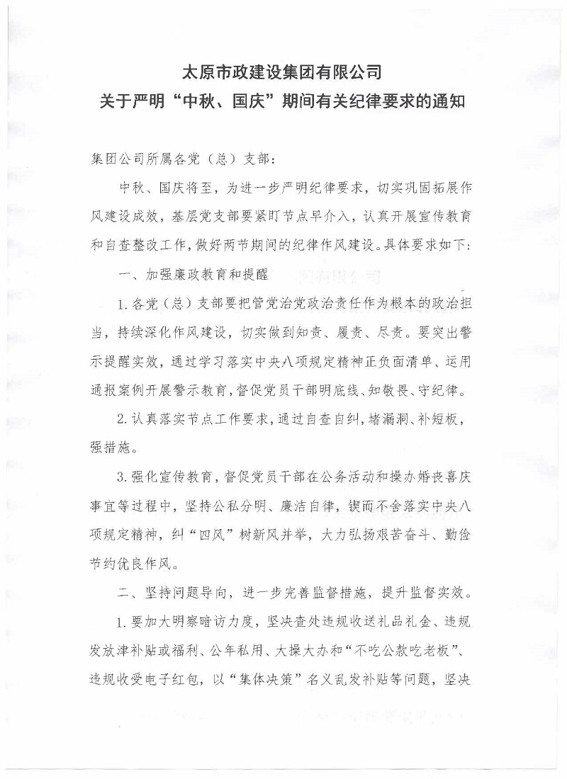 太原市政建設集團有限公司關于嚴明“中秋、國慶”期間有關紀律要求的通知