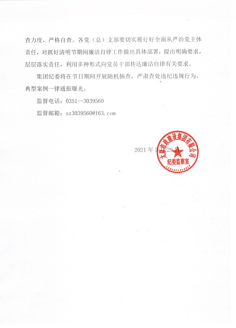 太原市政建設集團有限公司關于清明節期間加強廉潔自律工作的通知