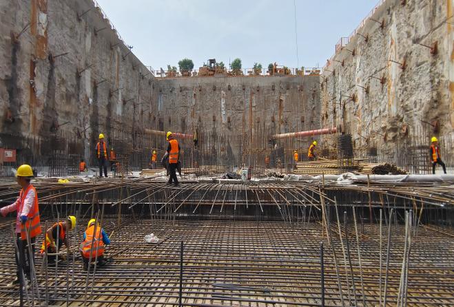 自工程開工以來,項目部合理規劃、統籌安排,先后完成了三軸水泥土攪拌樁、地下連續墻、抗拔樁、冠梁等一個又一個節點目標,高效推進工程建設。6月,為趕在汛期來臨前完成調蓄池和泵房底板混凝土澆筑的施工任務,項目部做足前期保障工作,針對基坑內作業面狹窄,土方、鋼筋、模板、混凝土澆筑等工程量大的情況。項目部緊密圍繞節點目標,從人員配置、材料供應、安全措施、設備保障等方面進行全面規劃、統籌部署,保證各工序相互銜接、有序推進。同時,項目部采取對人、材、機進行動態調整的方法,24小時不間斷安排作業,確保多個作業面同時施工,嚴格按日計算施工進度,全力推動工程進展。