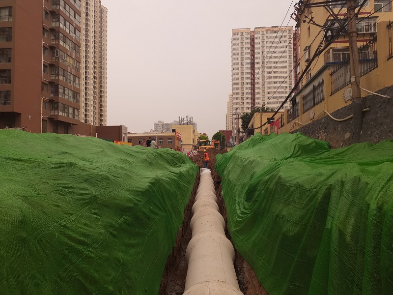 該工程是在利用城市現(xiàn)有排水設(shè)施的同時,兼顧周邊管道需求,進行的雨污水分流施工,共包括八條道路,二項目部負(fù)責(zé)城建巷、小溝街、新街南二巷、剪子灣路共四條道路的施工。四條道路均地處老城區(qū),施工路段的地下管線復(fù)雜,各類管線密布且使用時間較長,項目部果斷摒棄機械開挖方法,采取“逐層遞進”的施工方式,先利用機械挖掘路面表層,再采取人工開挖探坑方式探查現(xiàn)狀管線,逐步明確地下管線布局,制定專項施工方案,確保地下管線安全。因剪子灣路坡度大、排水困難,項目部在接收到降雨預(yù)警后,迅速組織施工人員采取行動,在陡坡頂端設(shè)置沙袋進行阻隔,中段采取雨水分流,保證雨水不會進入溝槽基坑內(nèi)部,最大程度減小施工影響,保質(zhì)保量完成了該條道路的污水管網(wǎng)施工任務(wù)。