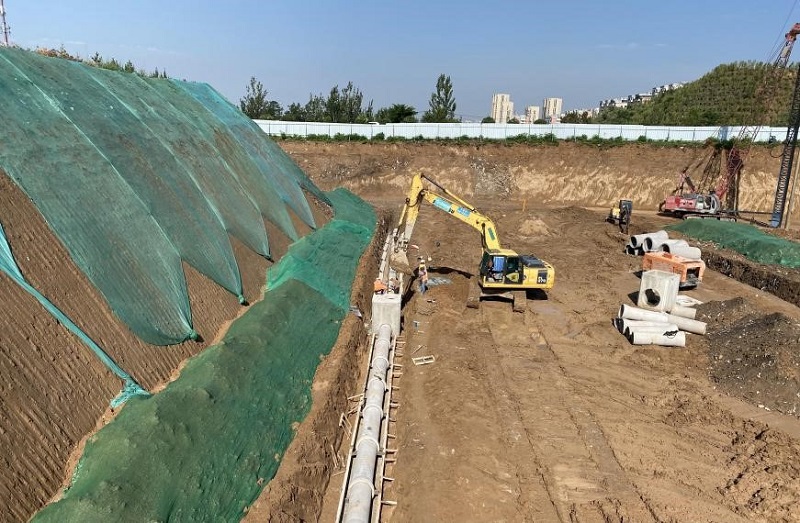 該工程雨污水管道、電力隧道的部分管線為深溝槽作業,溝槽平均深度為4米,最深處達6米。同時,該工程部分路段涉及挖方量大的情況,這些都增加了施工難度和危險系數。項目部技術人員根據施工現場實際情況,共同研究應對措施,制定了《深溝槽開挖專項方案》和《大挖方邊坡修整、支護方案》,采取了分級放坡開挖和邊支護邊開挖的方式,有效防止兩側土體的塌落;在挖方路塹施工時,及時掛網噴漿,有效維護了邊坡穩定;在開挖坡頂設置了截水溝,有效防止雨水的溝槽和邊坡的沖刷和浸泡,增加了施工的安全系數,切實保證了在溝槽和路塹開挖段內作業機械和人員的安全。