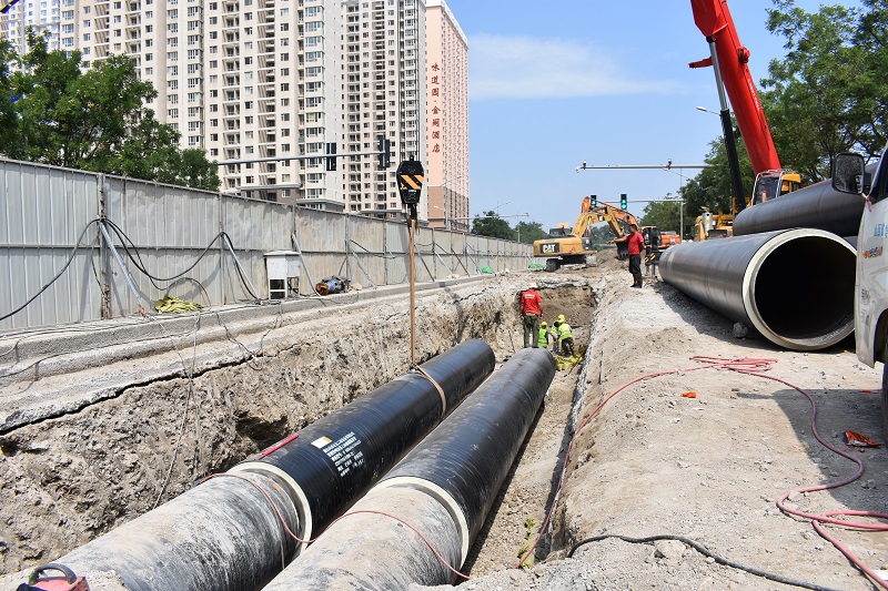 改造期間,項目部施工技術人員根據道路兩側預期規劃,提前制定了擴改方案,使用設計管徑為DN1000的供熱管道,為轄區內的小區預留出供熱余量。由于該工程位于老城區,地下管線尤為復雜,加之前期現狀管線資料不全,施工開始前,太原城市建設有限公司第五項目部的技術人員就提前做好溝槽的定位工作,采取整體放線、統一開挖的辦法,通過計算,提前讓熱力管道逐漸改變坡度,有效避開污水管道、燃氣管道等障礙物。同時,由于管道沿線區域地下水位高,施工人員根據現場實際情況,安裝了15個100毫米口徑的電動多級離心泵進行明排水施工,保證了施工進度。