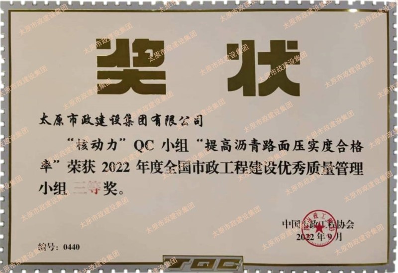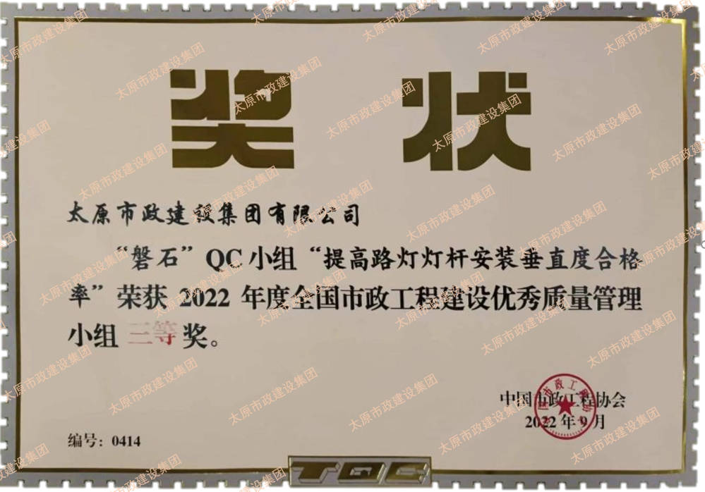 集團公司申報的“磐石”QC小組“提高路燈燈桿安裝垂直度合格率”、“核動力”QC小組“提高瀝青路面壓實度合格率”榮獲2022年度全國市政工程建設(shè)優(yōu)秀質(zhì)量管理小組三等獎。