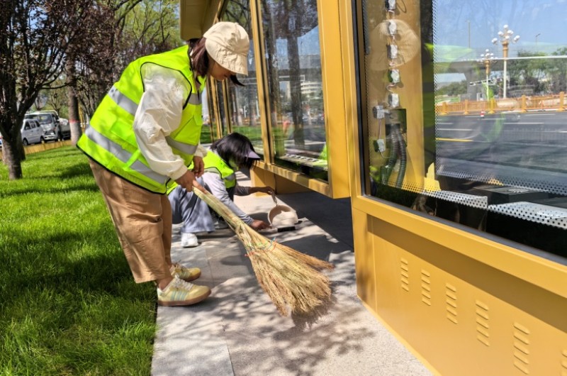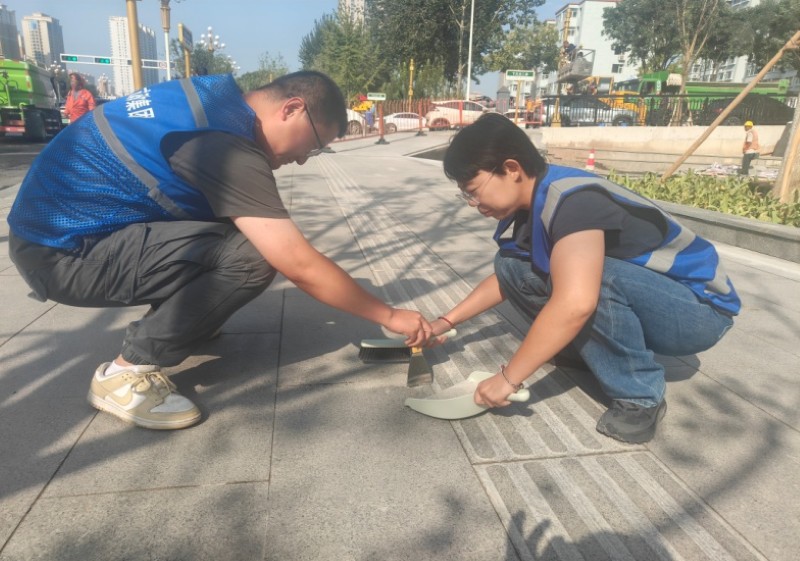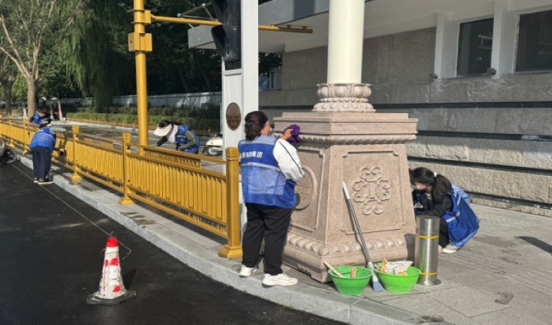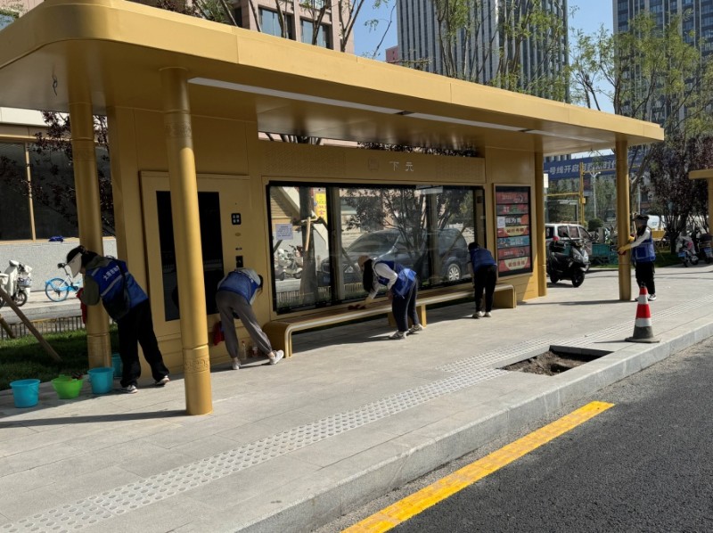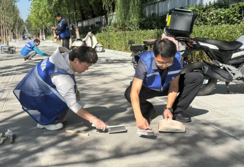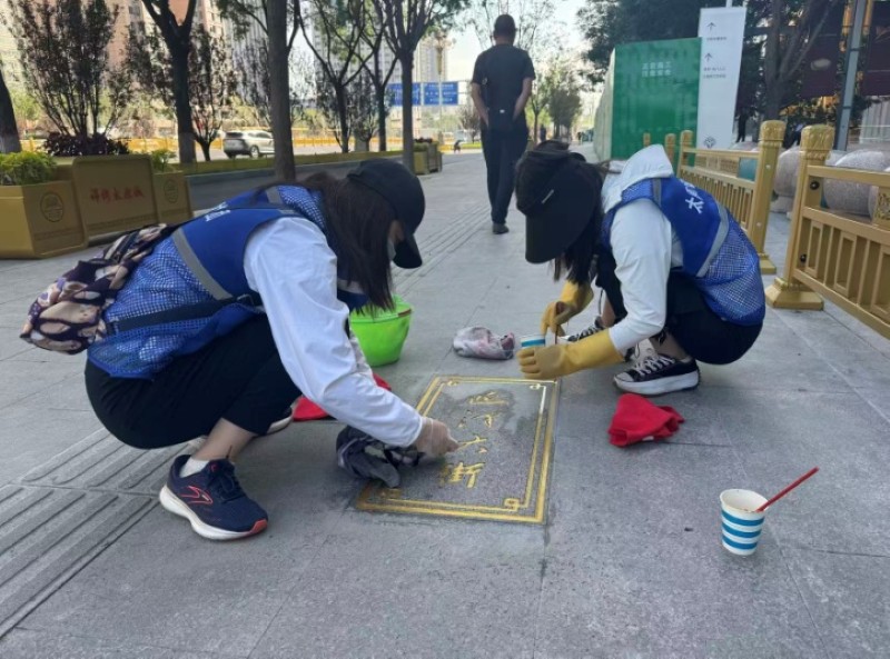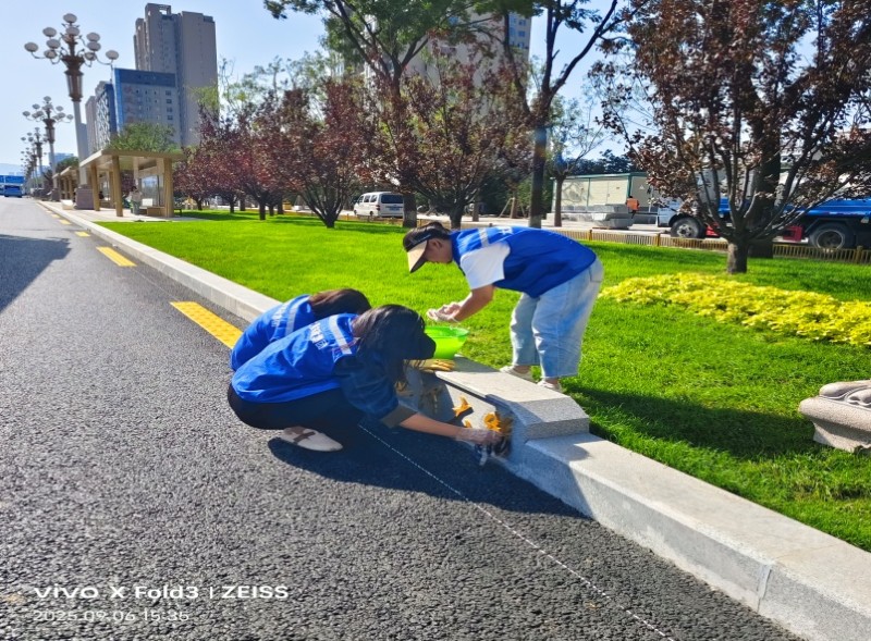 活動自9月4日起為期六天,覆蓋迎澤大街(西段)全線,重點圍繞附屬設施清潔與道路精細化維護展開。活動中,身著統一藍色“太原市政集團”馬甲的志愿者們,手持長柄擦洗器、水桶、抹布、鏟刀、掃帚等工具,對道路兩側公交站臺、路燈基地、護欄、照明燈桿等設施進行系統清理與擦洗;同步推進地磚灌縫精細化維護作業,通過專業操作,確保每一條裂縫都“嚴絲合縫”,有效提升路面耐用性與通行舒適度,以實際行動為市民出行安全與舒適保駕護航;同時,志愿者專門對道路沿線的石頭字景觀展開描金作業,細刷蘸取金色涂料,一筆一畫精心描摹,成為主干道上一道兼具文化氣息與視覺美感的獨特風景。
