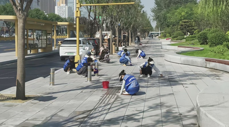 集團公司黨員干部率先垂范,職工緊密跟隨,近200名“市政藍”奔赴工程現場開展志愿服務,齊心協力對全線南、北半幅人行道的平石及側石進行描金修復與污漬清理,同步推進地磚灌縫精細化作業,細心擦拭燈桿、隔離護欄、指示牌、公交站臺等城市“家具”,勾勒出城市綠化宜居“金名片”。
