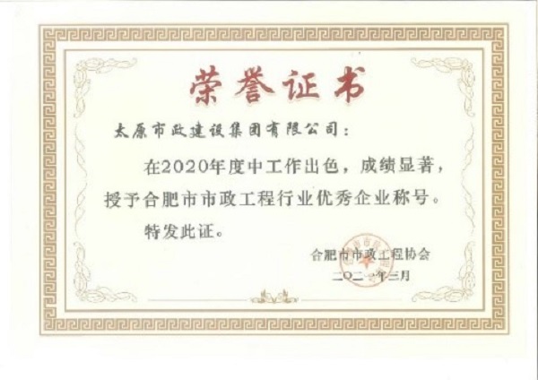 3月,集團公司榮獲合肥市市政工程協會頒發的2020年度“合肥市市政工程行業優秀企業”榮譽稱號。張晉虎、王東根榮獲2020年度“合肥市市政工程行業優秀項目經理”榮譽稱號。