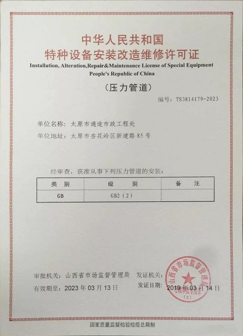 3月14日,通途市政工程處喜獲山西省市場監督管理局頒發的中華人民共和國特種設備安裝改造維修許可證,獲準從事GB2(2)壓力管道的安裝。這是通途市政工程處在資質業務上的又一重大突破,開辟了經營范圍的新領域,為企業今后的多元化發展奠定了良好基礎。