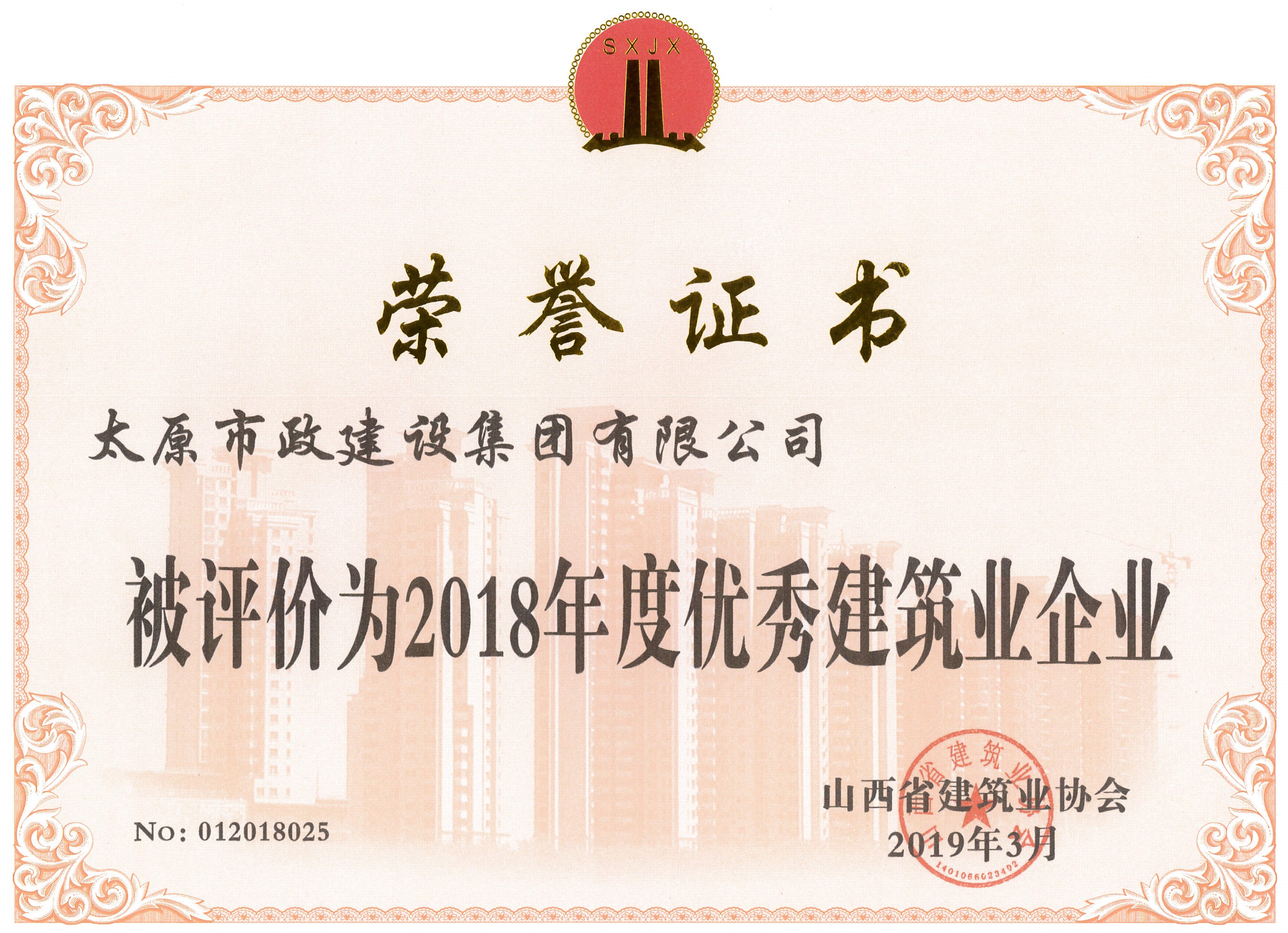 4月19日,太原市政建設集團有限公司被山西省建筑業協會評價為2018年度建筑業企業優秀等級。