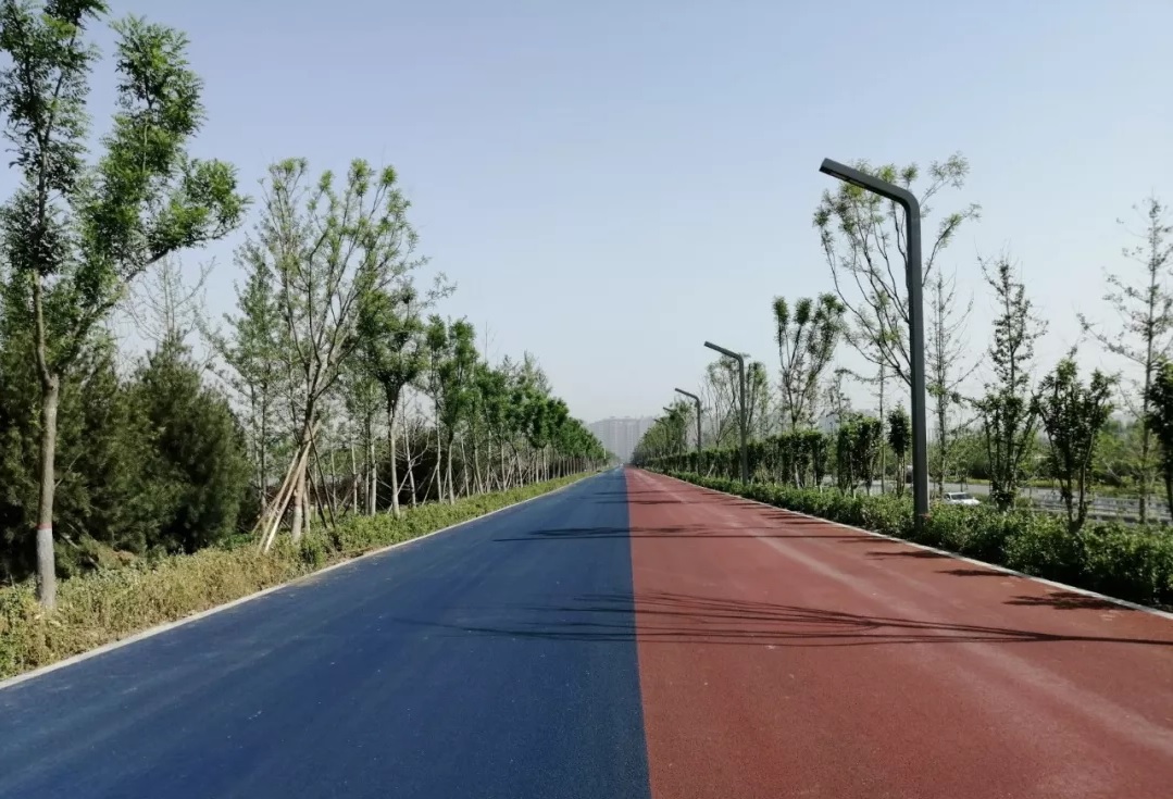 在道路鋪設過程中,為契合“二青”會體育精神,項目部在該工程面層鋪設彩色瀝青,不僅使路面更加干凈美觀,也為場館周邊道路增添一抹運動色彩。由于東大堤頂涉及國際自行車賽道,項目部制定可行性方案,在1、2號出入口施工中,采用墻端倒圓角處理,確保交通安全順暢。工程建設中,項目部全體參建人員不忘初心,堅守使命,以熱情燃燒“卡路里”,助力品質工程建設。