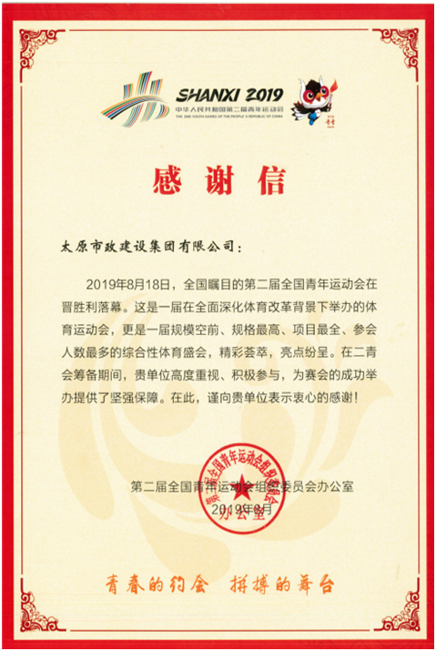 太原市政建設集團有限公司收到第二屆全國青年運動會組織委員會感謝信
