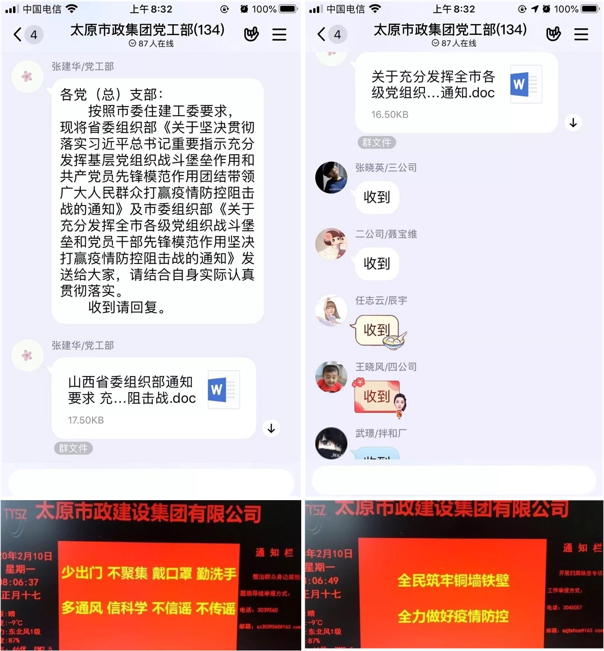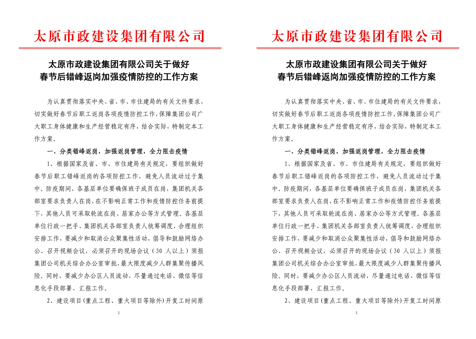 統一指揮,確保領導組織到位。為有效應對新冠肺炎疫情,集團公司迅速制定《太原市政建設集團有限公司新型冠狀病毒防控應急預案》,成立集團公司新型冠狀病毒感染的肺炎疫情防控工作領導小組,以強有力的領導統籌協調推進集團公司疫情防范和處置工作。同時,集團公司制定《太原市政建設集團有限公司關于做好春節后錯峰返崗加強疫情防控的工作方案》,對職工復工前以及返程中個人防護、網上辦公等事項作出詳細安排和明確要求,保障集團公司廣大職工身體健康和生產經營穩定有序。