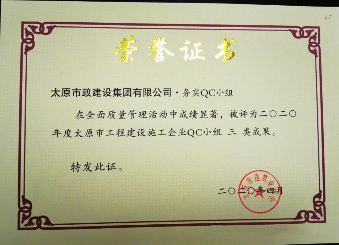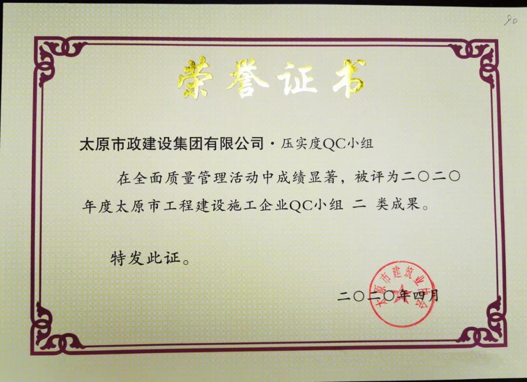 4月10日,集團公司壓實度QC小組的《濕陷性粉土壓實度控制》,被太原市建筑施工協會評為2020年度太原市工程建設施工企業 QC小組二類成果;集團公司務實QC小組的《提高檢查井旁人行道磚的觀感質量》,被太原市建筑施工協會評為2020年度太原市工程建設施工企業 QC小組三類成果。
