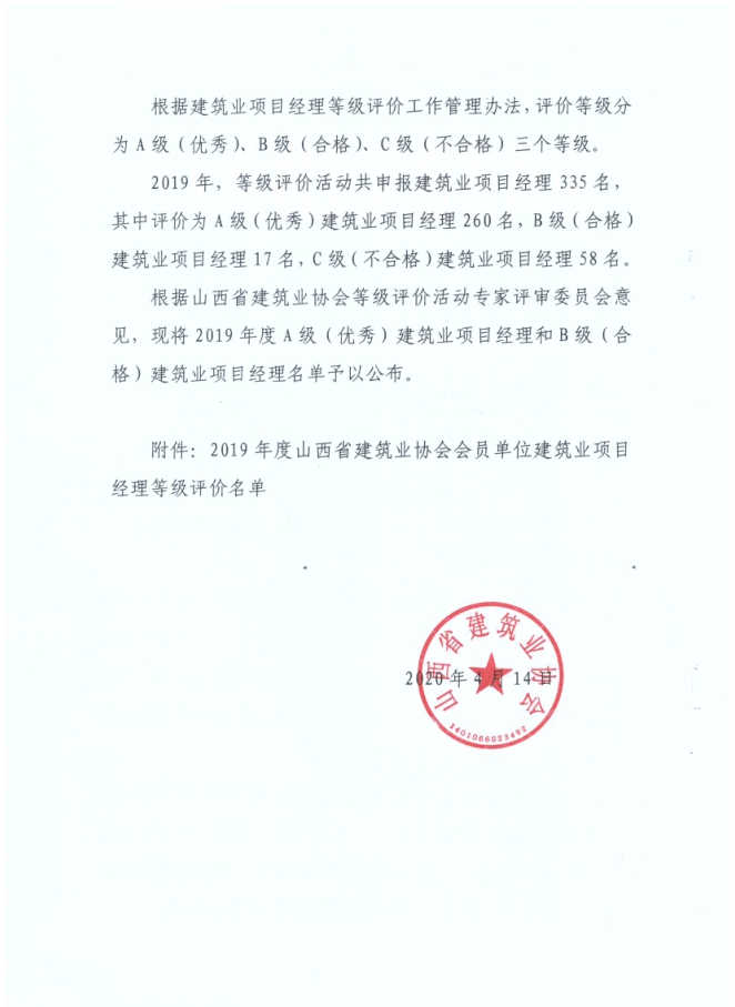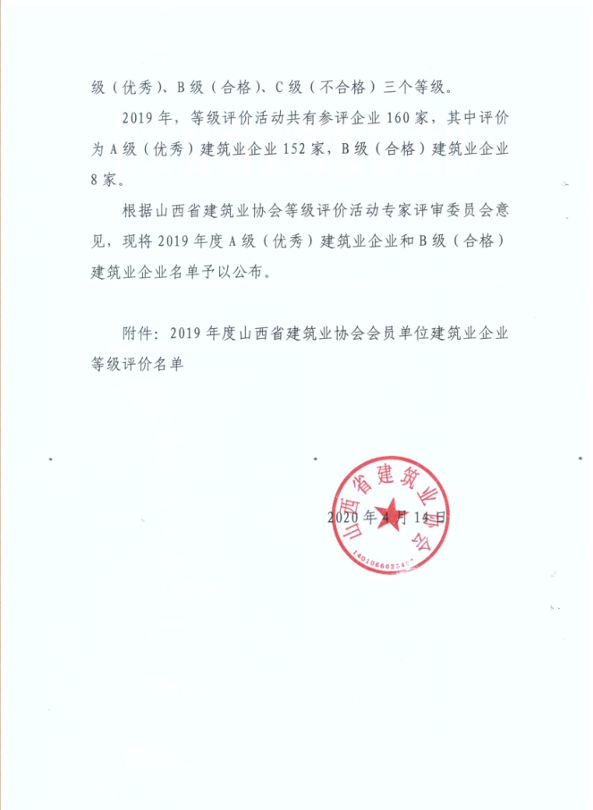 近日,山西省建筑業協會公布2019年度建筑業企業等級評價名單,集團公司被評為2019年度山西省A級(優秀)建筑業企業。