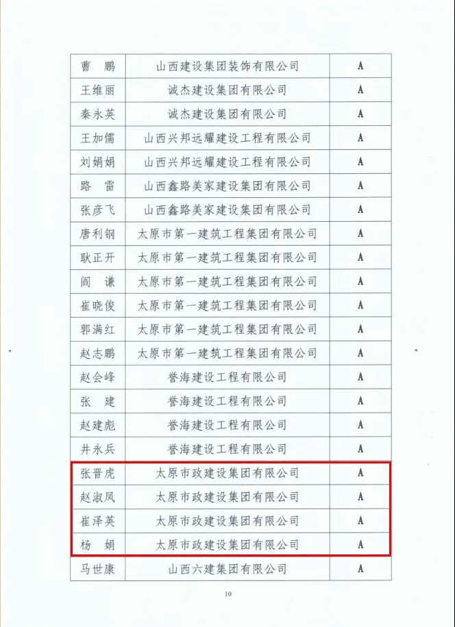 在“2019年度山西省建筑業協會會員單位建筑業項目經理等級評價”評選結果中,集團公司張晉虎、趙淑鳳、崔澤英、楊娟被評為2019年度山西省建筑業A級(優秀)項目經理。