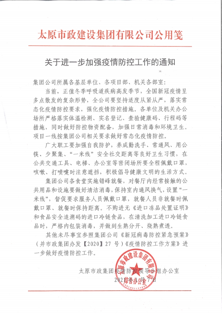 太原市政集團關于進一步加強疫情防控工作的通知