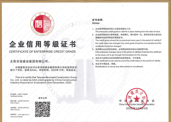 2020年12月24日,集團公司順利通過中國建筑業協會信用企業AAA級復評,證書有效期延至2023年12月23日。