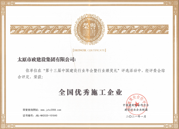 2021年1月13日,集團公司承建的晉陽污水廠主干管工程四標段、太茅路改造工程二標段、臥虎山快速路建設工程一標段、上莊街(西中環——少管所三岔口)道路改造工程被太原市建筑業協會評為2020年“太原市優良工程”,工程項目經理郝東輝、高鴻、李瑞金被評為“2020年度太原市工程建設優秀項目經理”。